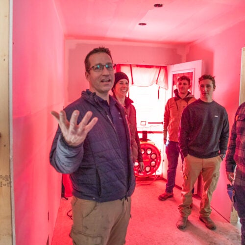 The test was done by Angele Heinrichs with Angèle’s Drafting & Design with the Enhanced Carpentry Foundation and Level 4 Carpentry students in attendance. A blower door test determines how airtight a house is under a certain pressure. It involves blocking an open door and using a fan to shift the pressure within the house and determine where any air is being pulled in. Drafts are common around windows and electrical outlets on the outside walls of the house.