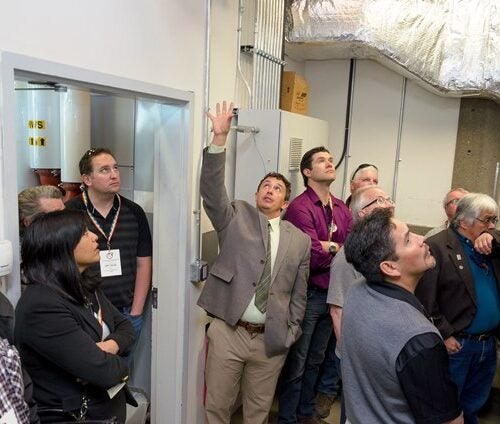 NLC’s director of Facilities, Todd Bondaroff, and Mark Heartt, dean of Trades and Apprenticeships, lead the tour, providing details regarding the clean energy technologies used in Energy House. The building uses such progressive approaches as solar energy for lighting, solar-thermal heating for hot water tanks, rainwater collection for running water in the restrooms, geothermal power for heating the CECET building (forced-air and in-floor heating), and a bio-mass pellet boiler system that supplies heating for the larger main campus building.