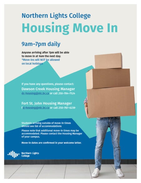Northern Lights College serves the communities of Northern British Columbia that are located on the territories of the Cree, Dene, Dunne-Za, Kaska, Saulteau, Tse’khene, Tahltan, and Tlingit. We also recognize Metis Nation BC members who live in this area of our beautiful province. We acknowledge our hosts and honour their gracious welcome to those seeking knowledge.