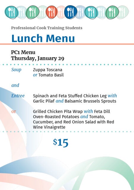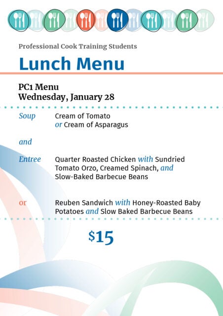 The Professional Cook Students serve their incredible lunches Wednesdays and Thursdays from 11:30am to 12:30pm.